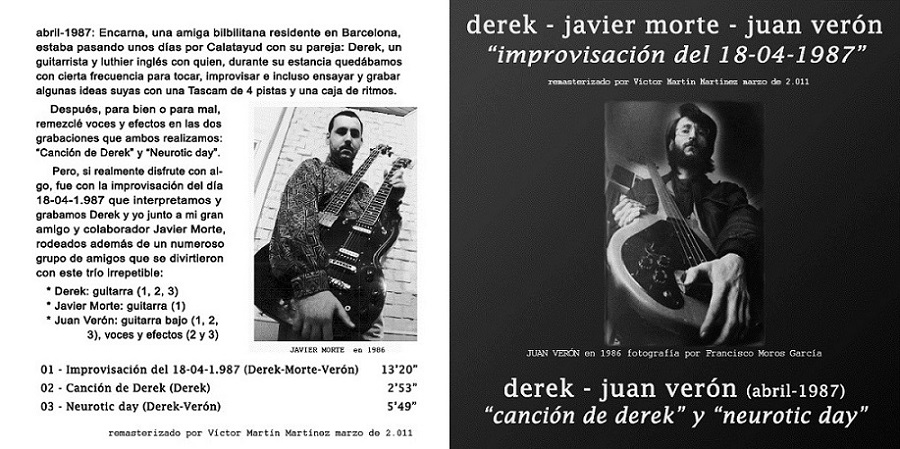 . Inicio - Consulta - Grupos Grupo:derek-morte-veronMunicipio: CALATAYUD - Provincia: ZaragozaEstilo Principal: Jazz-rock - Estilo 2: No constaObservaciones: Son Javier Morte y Juan Verón (de los grupos TRAUMA y TRAUMATEO) y un guitarrista inglés llamado Derek Titulo Caratula Formato Año Comentario improvisacion del 18-04-1987 maqueta 1987